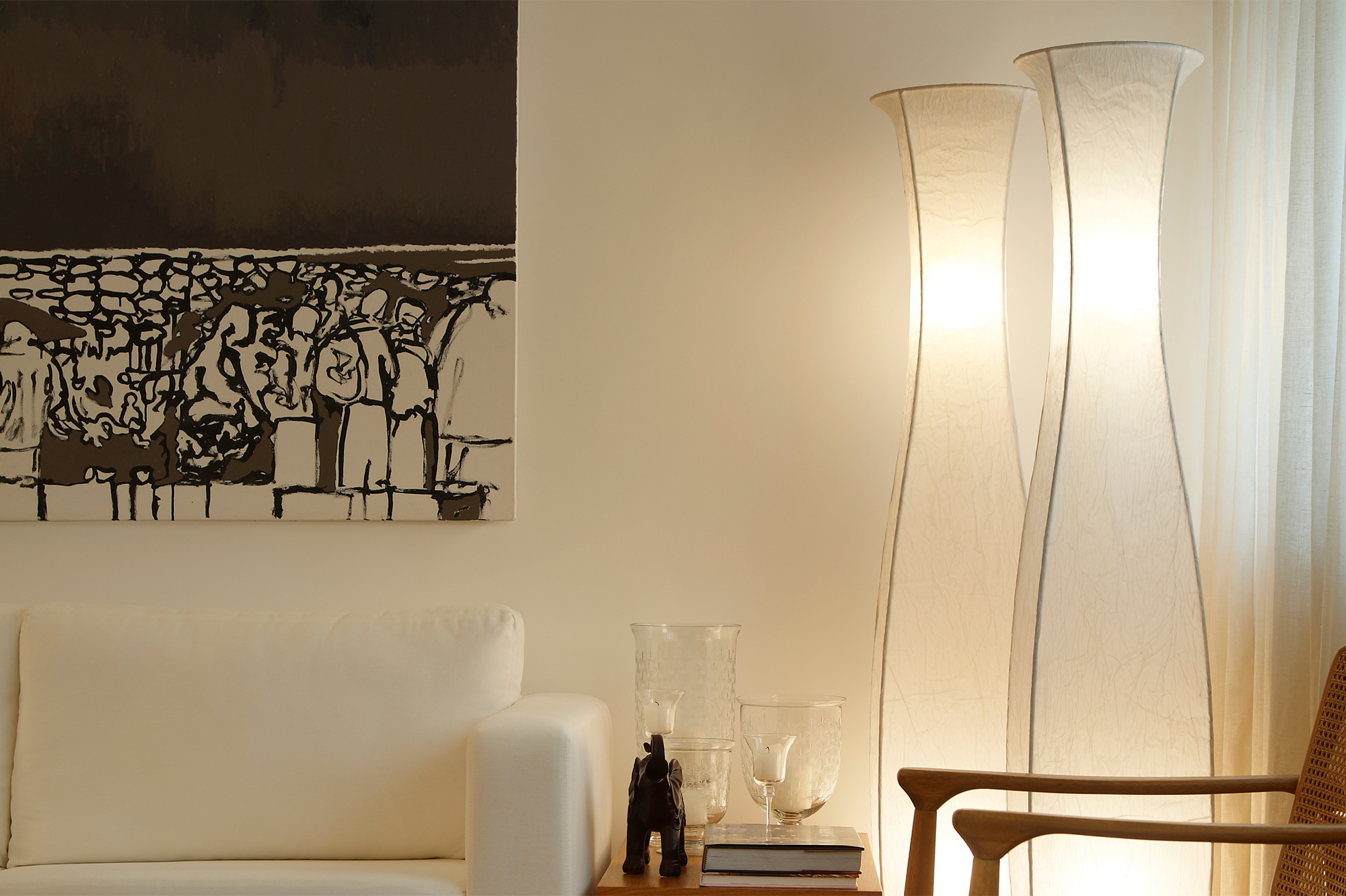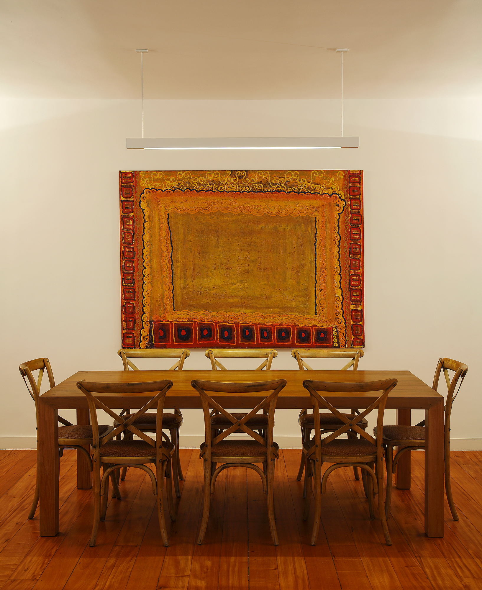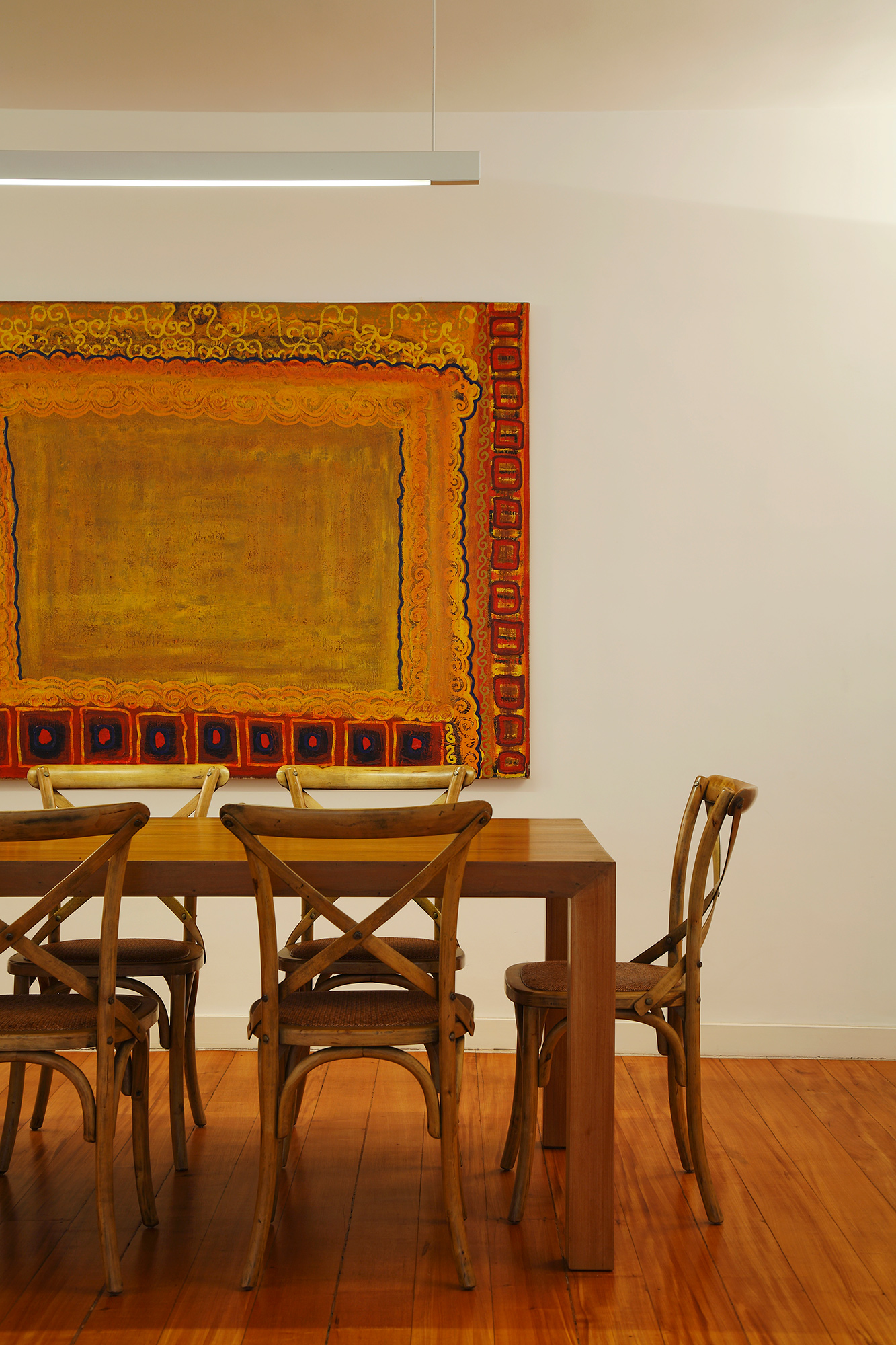 Madeira, branco e tons neutros, aplicados em diferentes texturas e materiais foram a base do projeto que teve as telas, de um artista da família, coloridas e de grande impacto na decoração, como protagonistas.